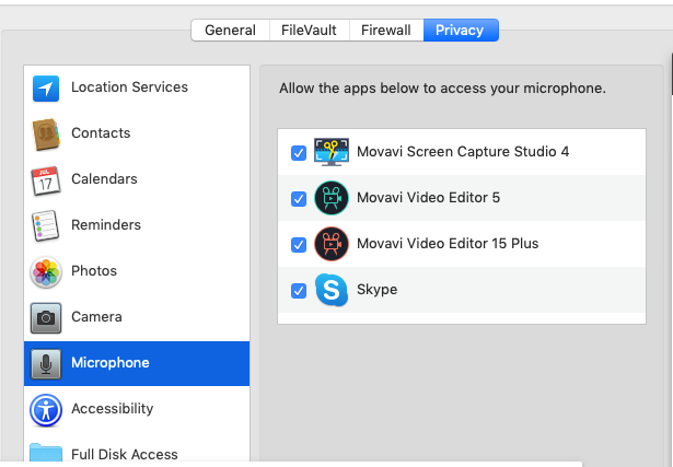 Remarque : si vous avez d'autres applications Movavi et prévoyez de les utiliser pour la webcam ou le microphone pour l'enregistrement, veuillez cocher à côté d'elles dans les onglets « Microphone » et « Accessibilité ».