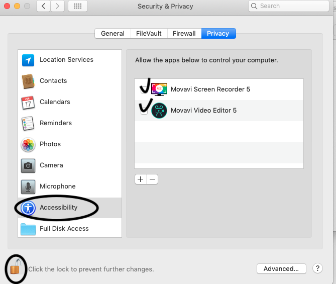 Double-cliquez sur l'icône de verrouillage en bas du menu et cochez Movavi Screen Recorder.