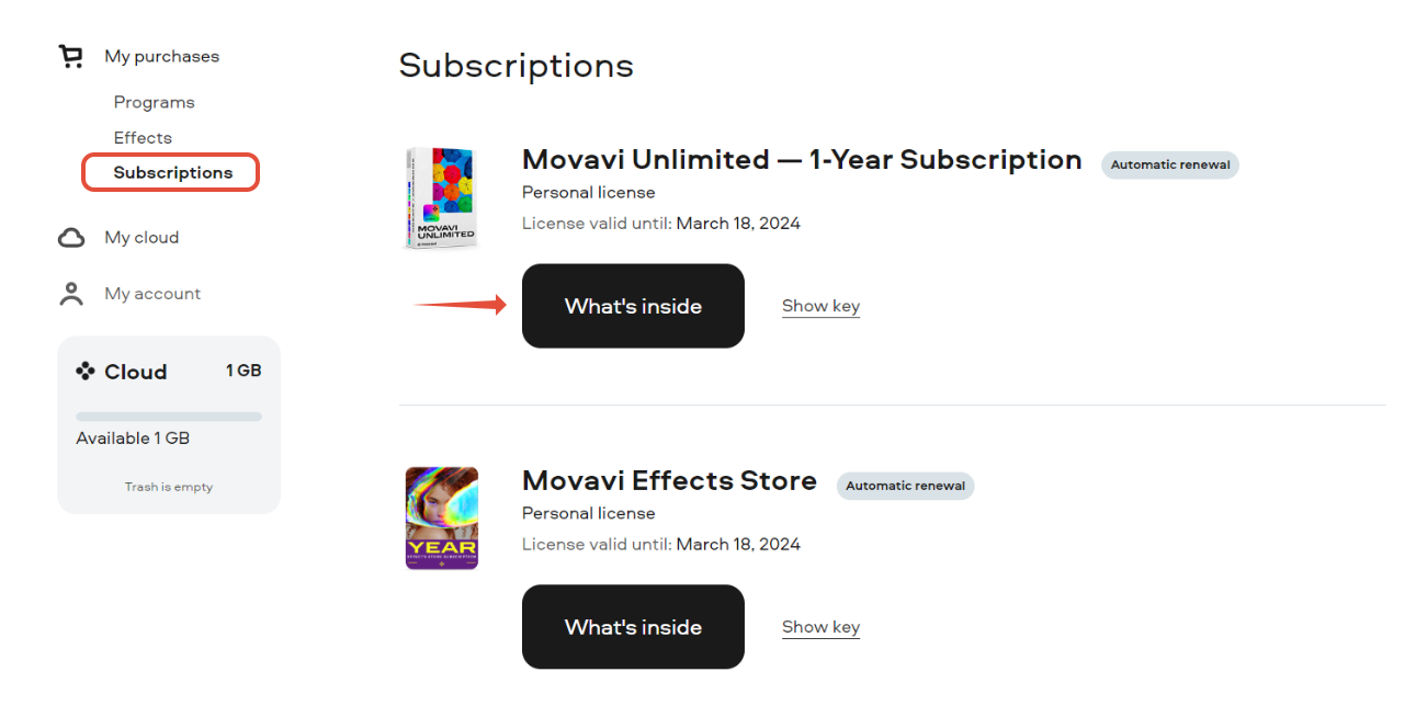 2. Depois de fazer login, abra a guia Assinaturas e clique em O que há dentro do Movavi Unlimited: