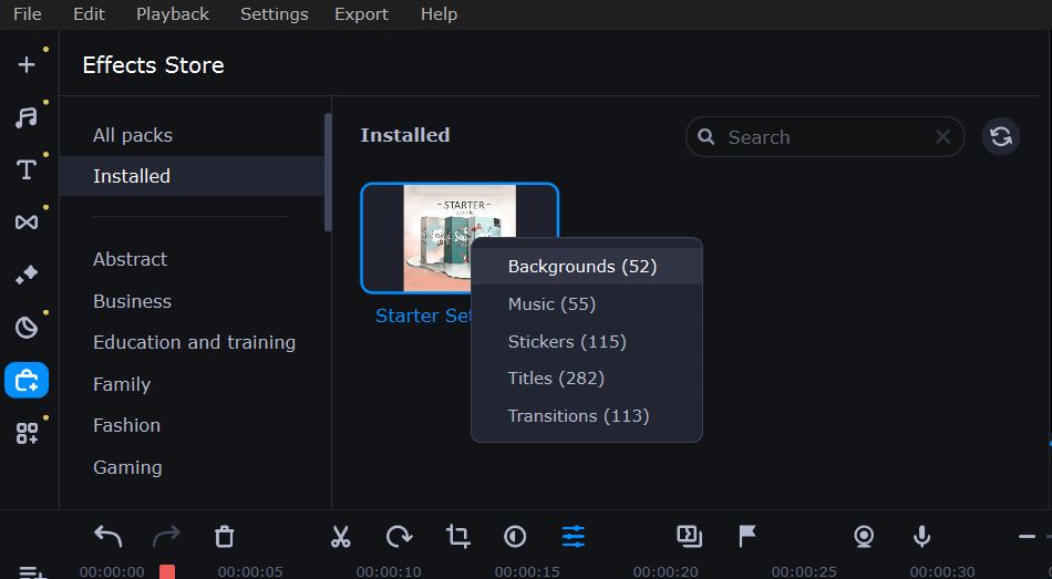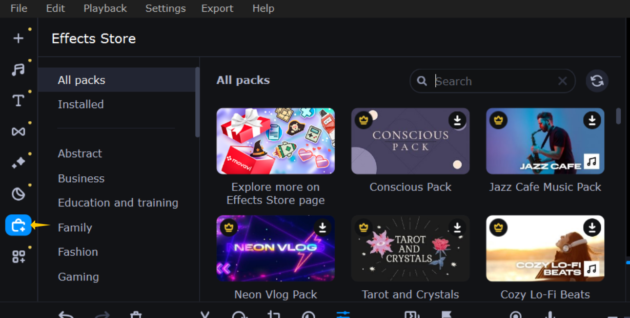 Basta ir até a aba Effects Store, clicar em cada pacote para fazer o download. Os pacotes que podem ser usados serão exibidos na guia Instalados.