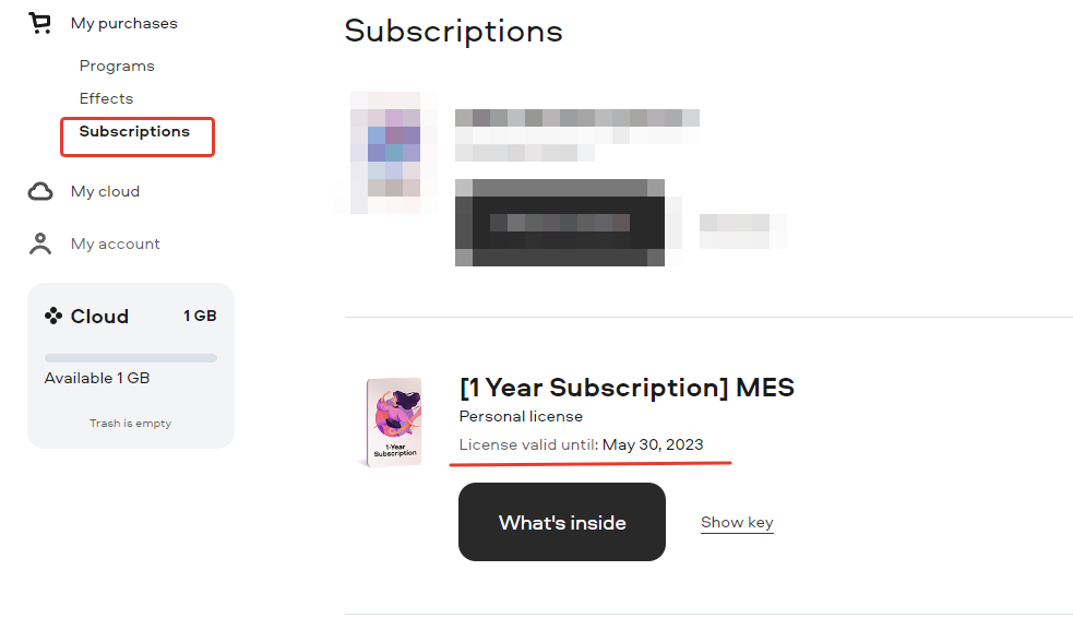 Além disso, você pode criar uma conta pessoal em nosso site oficial. Haverá informações sobre a data de validade da chave em ‘Minha compra’ – ‘Assinaturas’, conforme a captura de tela abaixo: